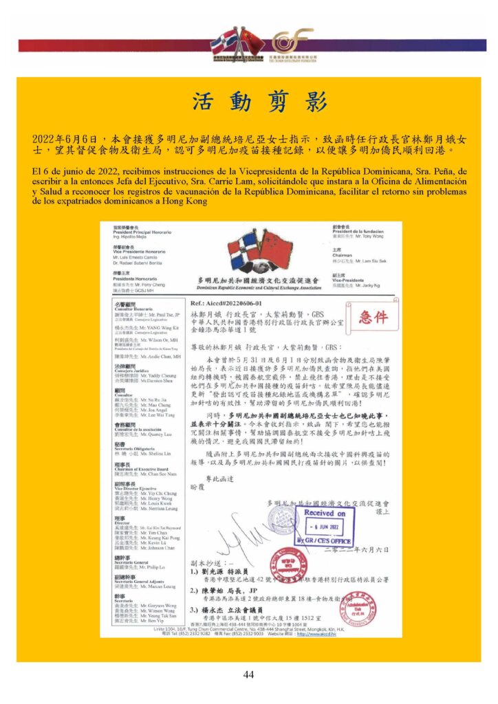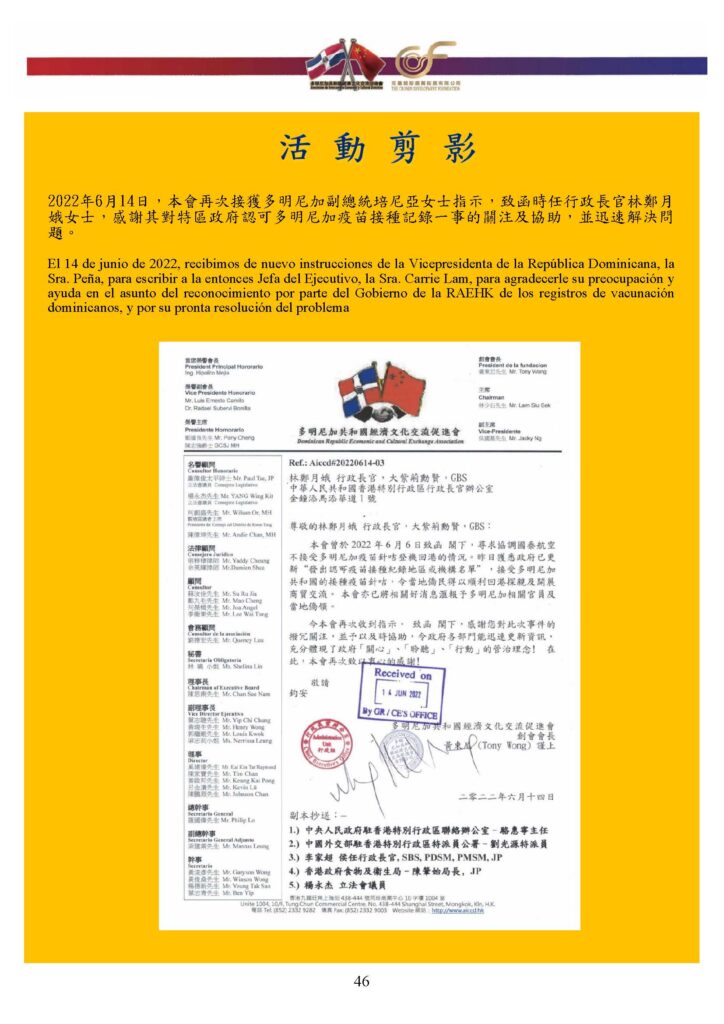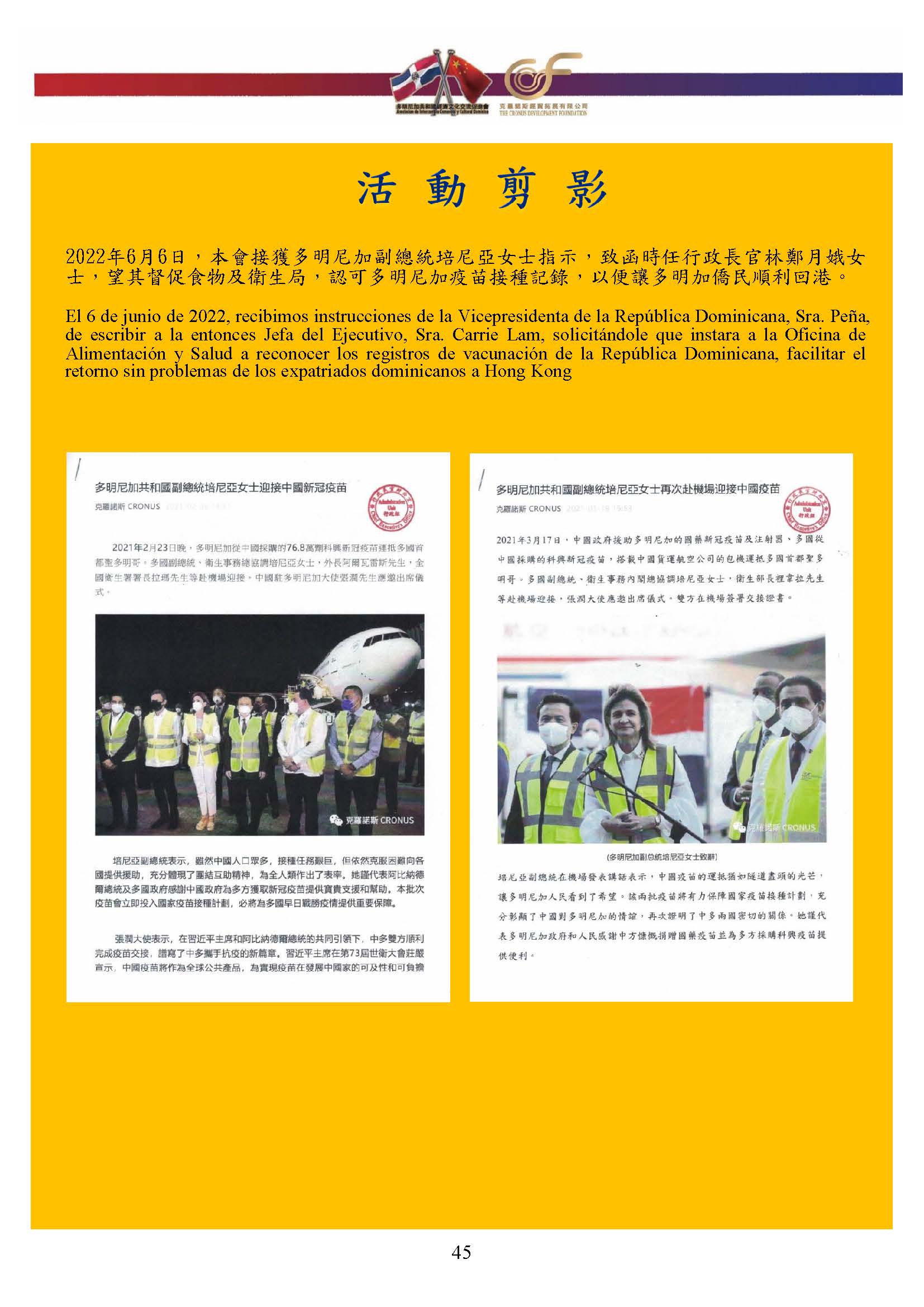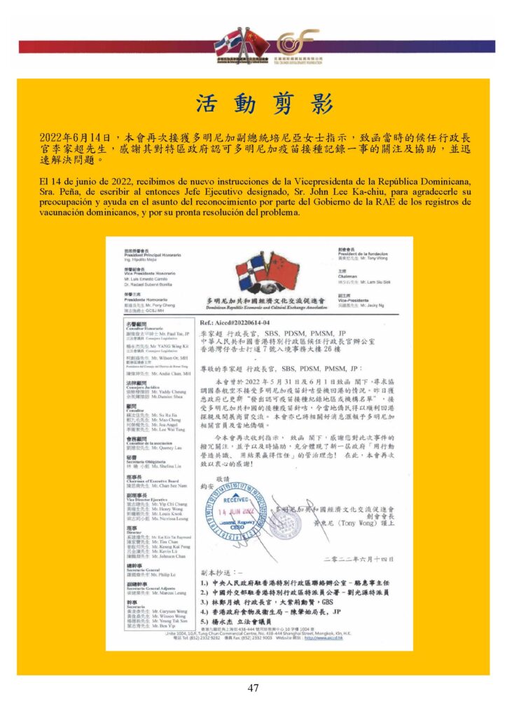 2022年6月,協會按照多明尼加副總統 Raquel Peña 的指示,先後致函當時的香港特區行政長官林鄭月娥及候任行政長官李家超,就多明尼加疫苗接種紀錄的認證問題表達訴求,期望便利多明尼加僑民順利返回香港。