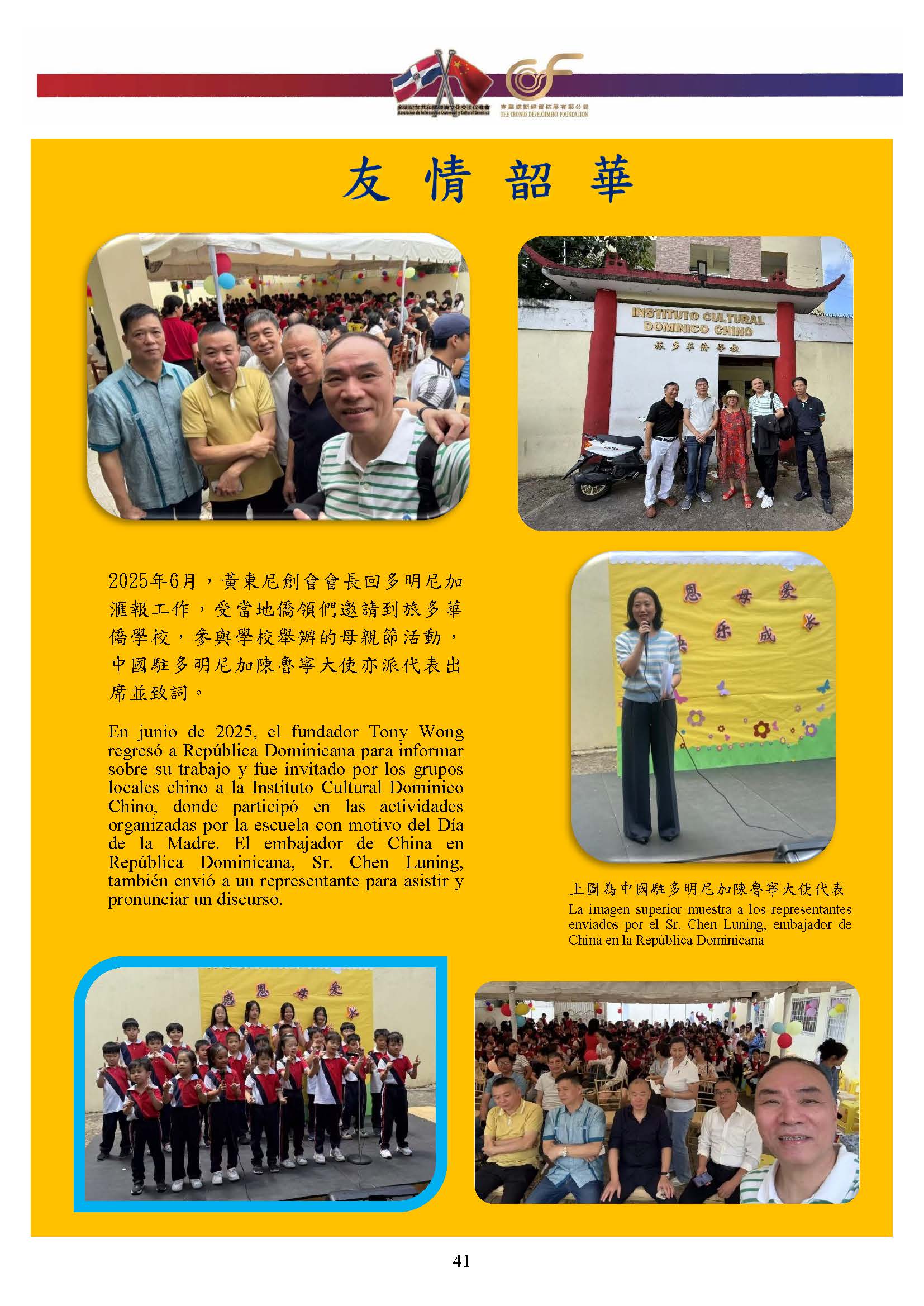 2025年6月,創會主席再度訪問多明尼加,獲當地華人社群熱情接待,並應邀參觀多明尼加中華文化學院,出席以「母親節」為主題的社區活動。中國駐多明尼加大使陳魯寧先生亦特別派遣代表出席並致辭,充分體現中多兩國在人文交流上的高度重視。此行創會主席亦走訪了當地唐人街,與僑社領袖深入交流,進一步鞏固兩地華人社群的緊密聯繫。