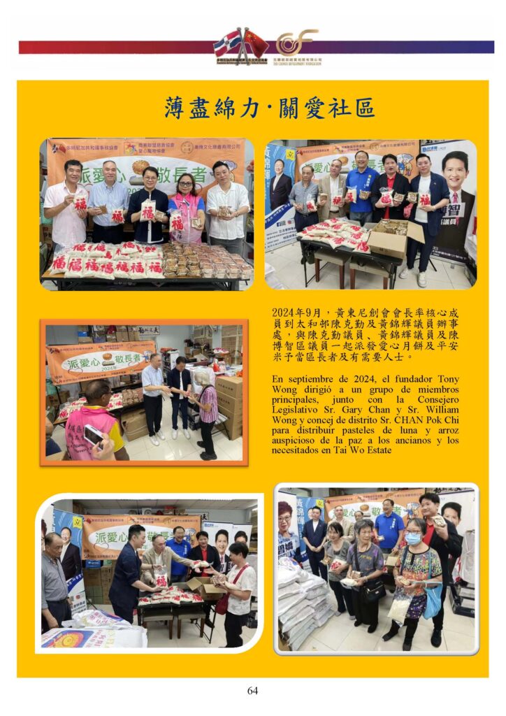 2024年9月,協會再接再厲,由創會主席率領主要成員,聯同立法會議員 Gary Chan、William Wong 及多位地區議員,分別前往大埔太和邨及樂富等地,繼續向長者及有需要人士送上月餅與平安吉祥米,將愛心延伸至更多角落。